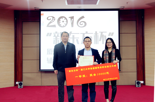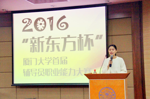 12月19日,“新东方杯”厦门大学首届辅导员职业能力大赛决赛在克立楼三楼报告厅如期举行。外文学院辅导员张闻博老师经过初赛和复赛的严格选拔,最终与其他九位辅导员一同进入决赛进行最终比拼。外文学院团委书记乐无恙老师,团委副书记、2016级本科生辅导员肖盈老师,2015级本科生辅导员周晓牧老师,2014级本科生辅导员杨盛澜老师及所有兼职辅导员到场观摩比赛并为张闻博老师加油助威。最终,张闻博老师以总分第一名的优异成绩荣获本次大赛一等奖。