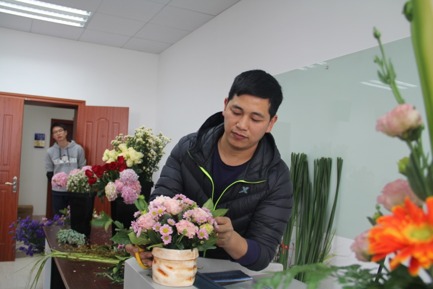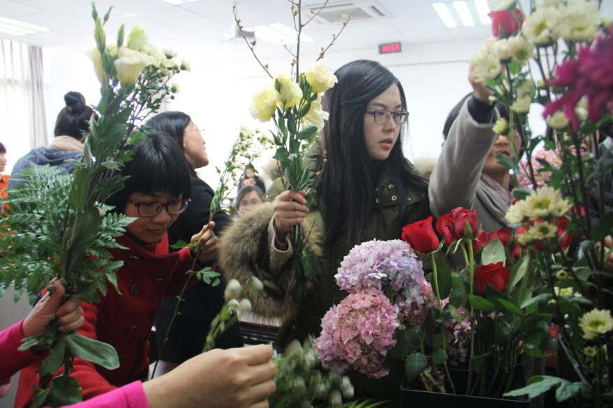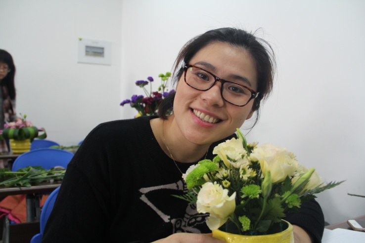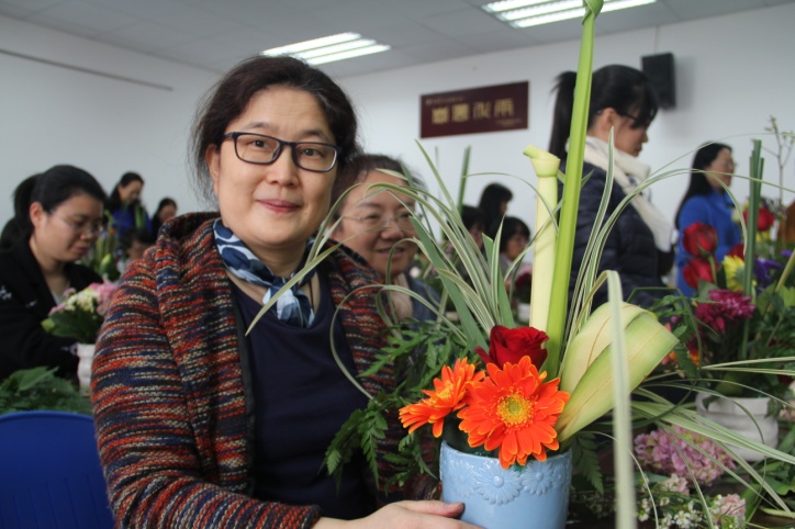 活动伊始,学院妇委会主任徐琪老师代表学院再次祝全体姐妹节日快乐,希望大家放松心情,共同体验插花艺术的快乐。为此,学院特邀国家级花艺师肖光荣进行现场插花教学,从鲜花名称、选花搭配、造型设计等讲解开始,随后现场制作了富有意境的中式风格插花和充满温馨柔美的家居插花作品。顿时现场互动气氛热烈,大家兴趣盎然,跃跃欲试。娇艳欲滴的红玫瑰、粉红可人的绣球花、艳丽夺目的太阳花、紫罗兰、勿忘我,还有非洲腊梅、尤加利、剑叶等等,各种花草在大家的巧手雕琢下各展风姿,或清新淡雅,或高端大气,或色彩绚烂,或新颖创意,一件件精美漂亮的花艺作品为外院增添了一道亮丽的风景线。看着自己亲手创作的插花作品,女职工们充满了成就感与喜悦感,大家纷纷与自己的插花作品合影留念,绽放出花一般的笑容。