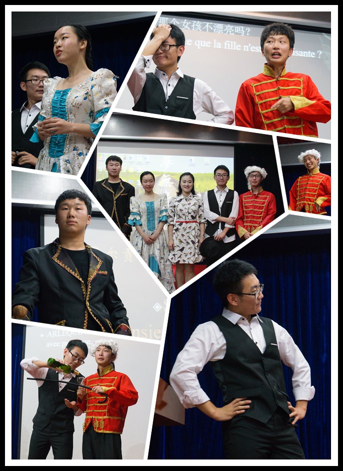 多样的法兰西文化远不止于一句话语、一曲香颂。在同学们的欢呼声中,帅气的外国友人Geoffrey MARCELLIN走上舞台,为同学们介绍les traditions de P?ques(复活节的传统习俗), 同时给在座的老师和同学们发放了与之相关食物巧克力蛋,现场氛围非常融洽。紧接着,来自本科三年级的Hélène(祖琳)、Daniel(唐国钦)、?velyne(沈洁欣),二年级的Jonathan(陈元浚)以及一年级的Sébastien(王清鹤)五位同学共同表演了法国话剧《Jeux de l'amour et du hasard》(爱情偶遇游戏)。他们身着法国传统服装,以流利动听的法语念白,不仅为观众呈现出一场视听盛宴,更是让在座的师生切身感受到法国人的生活片段、爱情观念。最后,来自本科二年级的Lydia(陈颂歌)以一曲极富感染力的香颂《Parler à mon père》(献给父亲的话)为晚会画下圆满句点。随后,主持人Guillaume LABOURDETTE宣布晚会圆满结束,同时邀请所有参与者上台合影,2017年美好的法语国际日晚会就此定格。