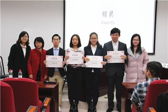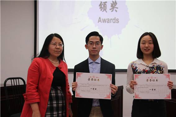 最终,由外文学院2016级硕士生章晨凯和2015级本科生薛静怡组成的“Say Here”队以出彩的表现、默契的配合夺得冠军,刘翔和张艺馨组成的“Peripatetic”队荣获二等奖,三等奖则由陈倩和王慧敏组成的“英语辩论”队及由宋迦南和裴浩然组成的“Knight49”队共同揽获。在个人奖项方面,章晨凯同学以其温和绅士的语言和条理清晰、逻辑缜密的辩述获得“最佳辩手奖”,薛静怡同学凭借其标准、清晰的发音获得“最佳语音奖”,张艺馨同学以其铿锵有力的发言获得“最佳台风奖”,刘翔同学通过富有感染力的手势、神态获得“最具表现力奖”。现场嘉宾和评委老师们共同为获奖队伍和选手颁奖。
