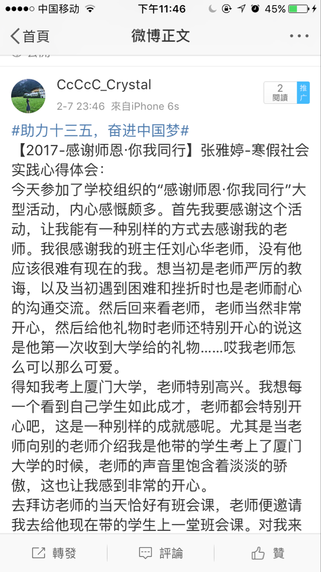 通过此次活动,实践队员们深深地感受到了感恩的重要性。一生中,需要感恩的人太多太多:度过难关时来自他人的帮助;获得温暖时来自他人的关怀;需要力量时来自他人的鼓励;开化蒙昧时来自他人的教育……凡事都需要感恩,每个人都应学会感恩!所以在完成社会实践活动之余,实践队员还通过微博、易班等途径对活动进行了宣传,让感恩的火把传递下去。