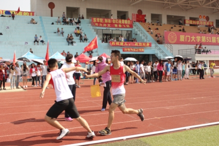 时近中午,11点10分,女子4*100米接力赛预赛开始,华体网2016级硕士生高华雪、林晔、张延香和吴翠莲四位姑娘在跑道上蓄势待发,枪声一响便全力以赴。随着赛道两边的震天呐喊,外文姑娘们依次起跑、冲刺、有条不紊地交接,即使在最后一棒交接时被其他选手干扰,她们依然赛出了自己的水平,也给外文学院交出了令人满意的答卷 。