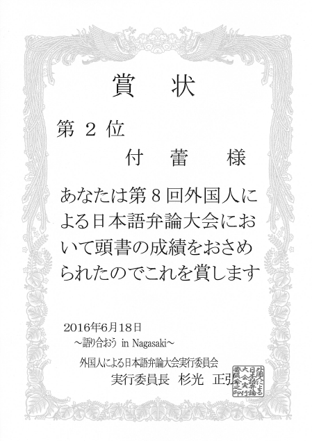 本次演讲大赛由日本长崎和平推进协会和长崎县国际交流协会主办,分为预赛和决赛两个环节。今年的主题为“外国人眼中的日本?和平?国际交流”,要求选手就此进行5分钟的命题演讲。付蕾同学以日本熊本地震为切入点,发表了自己对于日本社会和日本人的看法,最终凭借独特的视角和稳健的台风获得了本次大赛的第二名。