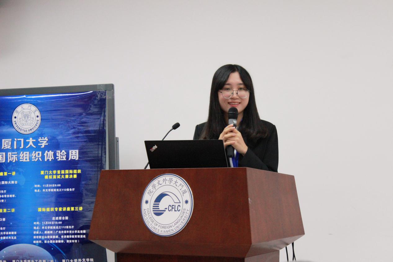 厦门大学首届国际组织体验周暨厦门大学“外国语言文学创新实验班”启动仪式后,包括厦门大学首届国际组织模拟联合国面试大赛决赛、国际组织专家系列讲座等在内的各项活动如期举行,吸引了众多同学的积极参与。
