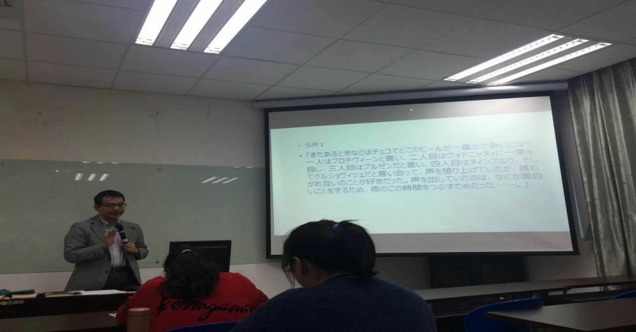 讲座吸引了许多本科生和研究生,更有其他学院的老师及热心社会人士参与。讲座开始,阿部副教授首先引用日本学者筱田一士的随笔和国民诗人宫泽贤治的诗作,说明了“食”与文学的重要联系。接着通过其个人主要研究领域捷克文学和日语系所熟悉的日本文学两方面,说明了饮酒与文学长久深刻的联系,并为这一领域上日语系学生的未来研究提供了珍贵意见。讲座过程旁征博引,从捷克传统酒馆“Hospoda”的文学背景讲起,通过20世纪后半期捷克代表作家博胡米尔·赫拉巴尔的代表作,结合社会学概念解释了中欧文学中作为交流场所的小酒馆对语流体为主的小说的重大影响。再引用柳田国男,太宰治、村上春树等日本作家的文章,来说明日本文化背景下饮酒方式及其社会印象。从比较文学的角度提供了妙趣横生的解读,同时为专攻一门语言的日语系学生提供了崭新的思考方式,令人受益匪浅。