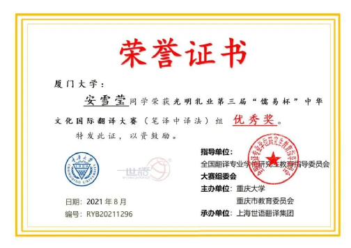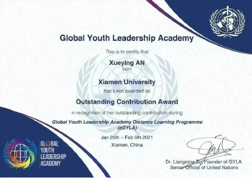 作为首届厦门大学外国语言文学创新实验班的成员,安雪莹参加了2021年联合国国际青年精英领袖班(GYLA)项目,并在GYLA项目中参与了才艺展示组的工作,主要负责收音统筹和节目协助。在两周的学习中,她投稿GYLA daily并成功刊登关于SDGs的文章;积极书写自己的“学员之声”并发布微信公众号文章,获得颇多阅读量。最终,她从各大高校学生中脱颖而出,获得了“杰出贡献奖”。