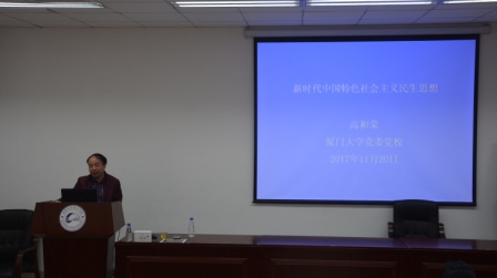 “十九大报告体现的民生思想怎么看”,“如何理解全面建成小康社会含义”,“为什么说社会保障体系事涉总体国家安全”……带着这些问题,11月20日下午,外文学院教职工们走进第十期红色外文大讲坛,聆听校学习宣传贯彻党的十九大精神宣讲团成员,校党委党校常务副校长高和荣教授带来的“习近平新时代中国特色社会主义思想解读”十九大精神专题辅导报告。报告由学院党委书记陈志伟主持。高老师为大家梳理了报告中体现的社保、民生方面的建设成就,对比了中西方社会保障待遇提高的不同方式,并结合十九大报告原文,为大家展示了未来社保制度的规划与发展战略。高老师的讲座大到国家大政方针,小到老师们手头一张社保卡,管中窥豹,点面结合,给大家提供了学习十九大报告的全新视角。报告结束后,老师们踊跃提问,就各自关心的医疗、社保问题与高老师深入交流。有老师表示,原来十九大报告如此贴近自己的生活,也对未来国家和老百姓两个层面的走向掌握得更清晰了。