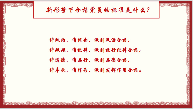 支部党员共同学习了新形势下合格党员“四讲四有”标准,即讲政治、有信念,讲规矩、有纪律,讲道德、有品行,讲奉献、有作为。“四讲四有”不仅是一名合格党员的核心要素,更是全体党员思想、工作和生活的坐标。作为党的“细胞”,党员的一言一行、一举一动都事关党的形象。会议强调,中国共产党的作用、地位和生命力,源于它始终保持着自己的先进性,我们作为中共党员,必须要时刻牢记自己的党员身份,永葆蓬勃朝气,永远做人民公仆、时代先锋、民族脊梁。