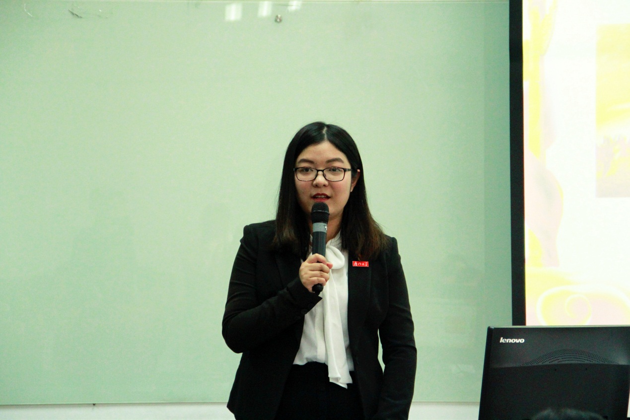 杨盛澜老师首先解读了“大会主题”、“极不平凡的五年”、“新时代”、“新时代的主要矛盾”、“新时代的历史使命”这五个关键词。她从党的十九大主题及其意义两方面介绍了十九大的背景;用十大方面的历史性成就解读了“极不平凡的五年”;介绍了习近平总书记赋予这个“新时代”的五个定位;阐述了“新时代的主要矛盾”和“新时代的历史使命”。最后,她引用了习近平总书记的一番话作为总结——“今天,我们比历史上任何时期都更接近、更有信心和能力实现中华民族伟大复兴的目标”,以此鼓舞同学们的斗志,号召大家为实现中国梦而奋斗。杨盛澜老师充分而独到的解读,使大家对十九大精神有了更深刻的理解,同时也激起了现场听众的自豪感和责任感。在解读这五个关键词的同时,杨盛澜老师还通过提问的方式积极与在场师生互动。现场听众积极活跃,踊跃发言。