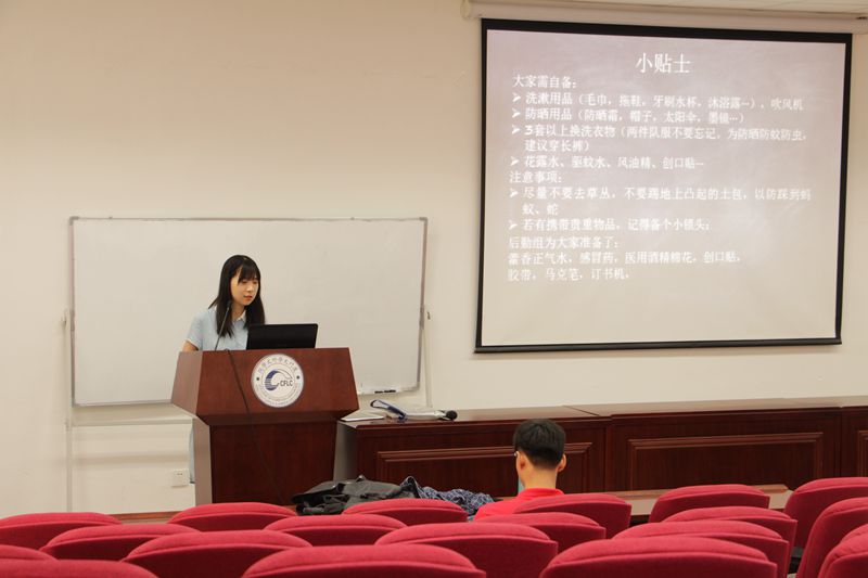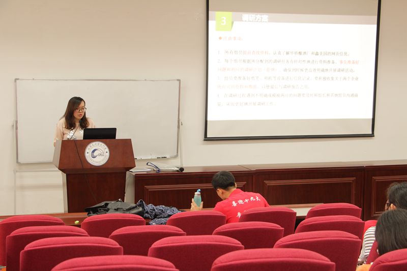 此外,实践队各组组长也分别就各组的实践内容和注意事项作了详细的说明。实践队队长郗谢首先说明了此次社会实践活动的大体概况,并重点介绍了实践地点竹坝学校的概况、实践内容、实践队伍、项目优势、以及实践活动的具体行程安排。调研组组长严昕以“厦门竹坝地区新旧企业发展的思考---以华侨酿酒厂和鑫美园为例”为题,围绕“创新创业”主题对小组活动做了详细说明。支教组组长王有智介绍了支教活动相关事宜,支教组不仅将在课堂上向学生呈现丰富内容,如日语、俄语课、书法、音乐课等,而且还在素拓中为学生们准备了各种游戏,让队员们能够尽快和学生们相互熟悉。后勤组组长刘梦迪就此次实践的经费预算、住宿情况等做了细致解说,此外还对此次活动中队员们需要准备的物品列出了温馨小提示,为全体队员们做好了充足的后勤保障。宣传组组长宁珍琦为队员们精心制作了“宣传宝典”,再次强调了宣传工作的各项内容和注意事项。最后,带队老师黄锦鸿作此次出征仪式的总结说明。