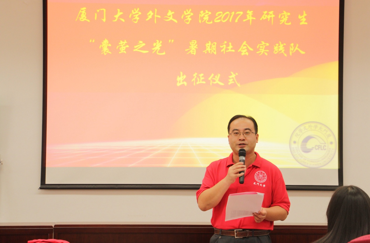 7月20日下午,厦门大学外文学院研究生“囊萤之光”暑期社会实践队出征仪式在南光三112报告厅成功举行。实践队指导老师、外文学院团委书记、研究生辅导员乐无恙老师和实践队带队老师、院研究生兼职辅导员黄锦鸿以及实践队全体队员悉数参会,本次会议由乐老师主持。