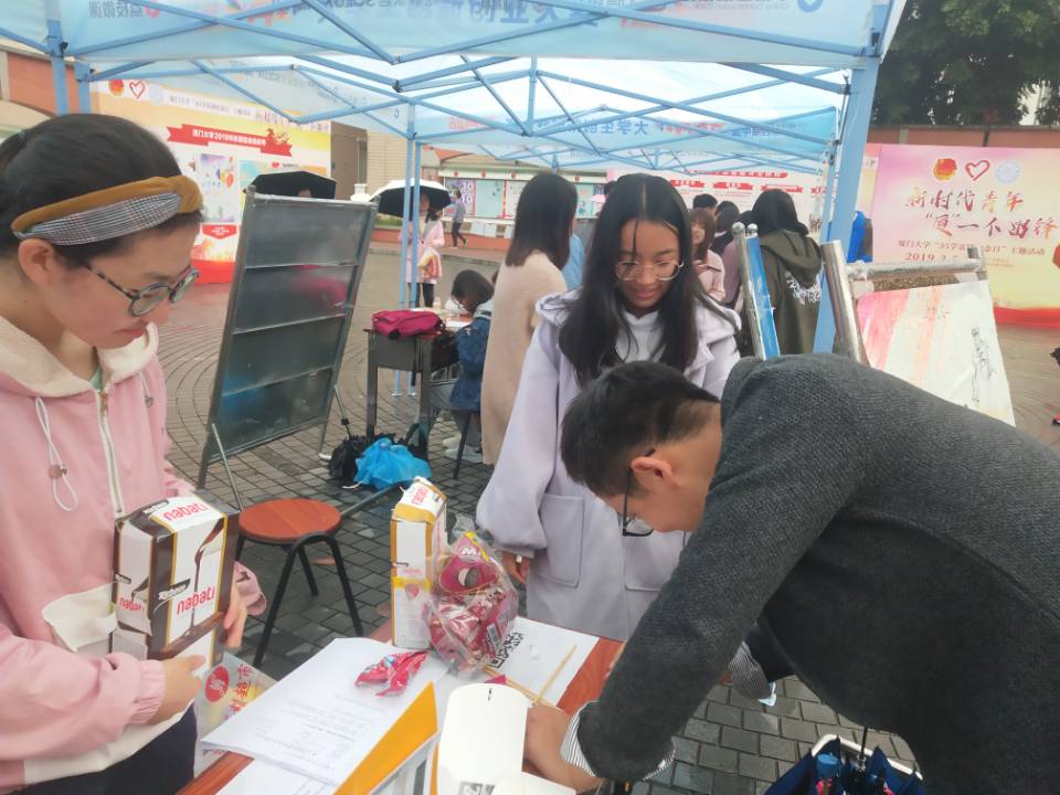 上午9点30分,参加路演活动的志愿者们便已将帐篷、桌椅、海报、照片等摆放就绪,做好了项目展示的前期准备工作。虽然当天下着小雨,但在学习雷锋同志“钉子精神”的鼓舞下,志愿者们依然以积极的态度、饱满的热情参与到活动中去,有序地组织着路演活动的进行。有的志愿者手捧教案与照片,向同学们展示过往的志愿服务经历,讲解项目的具体内容;有的志愿者在南光餐厅和芙蓉湖畔附近发放传单,吸引同学前往了解项目信息,参与志愿活动。