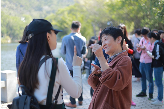 当天参加秋游活动的聋人中有耄耋老人,也有刚上小学的小朋友,他们的身份各不相同,但手语把聋人朋友和厦大学子们紧紧联系在了一起。