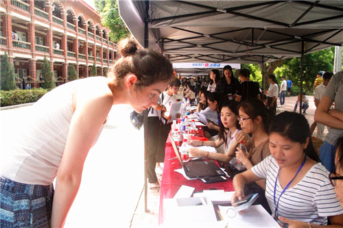 在炎炎烈日下辛勤忙碌的,除了注册组的志愿者们,引导组、行李组和宣传组的同学们也在烈日下辛勤地忙碌着。引导组的同学们高举外文学院院牌在校门口等候新生并将他们引导至迎新点;还有些引导组的志愿者来往于与注册点与宿舍之间,为新生们带路并介绍校园;行李组的同学们则守在行李运送点,为新生们送行李并仔细做好登记领取工作;宣传组的同学在世界地图前为每个新生拍照留念,将他们初进校园的灿烂笑容永久保存在相片之中,并引导新生们和家长们扫码关注外文学院官方微信平台“厦大外文CFLC”获取学院的最新资讯。