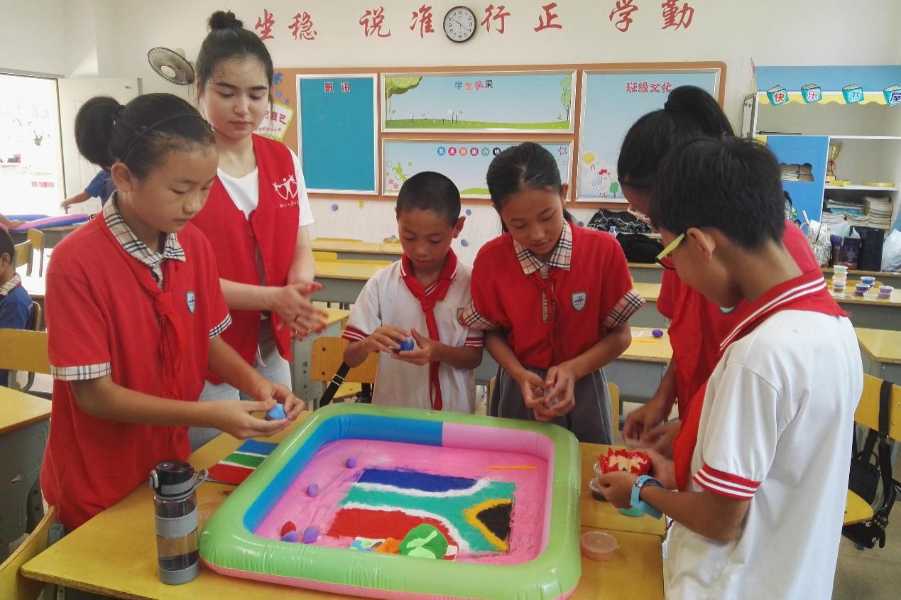 最后两天,实践队开展了“绿色环保迎金砖”手工制作、“一沙一金砖”沙盘创造、“小小朗读者”传中华魅力、“玩转金砖”知识游戏、“变废为宝”制作运动小道具等多项活动。小朋友们和队员们一起动手动脑,用独具特色的作品表达了自己对金砖会晤的期待。