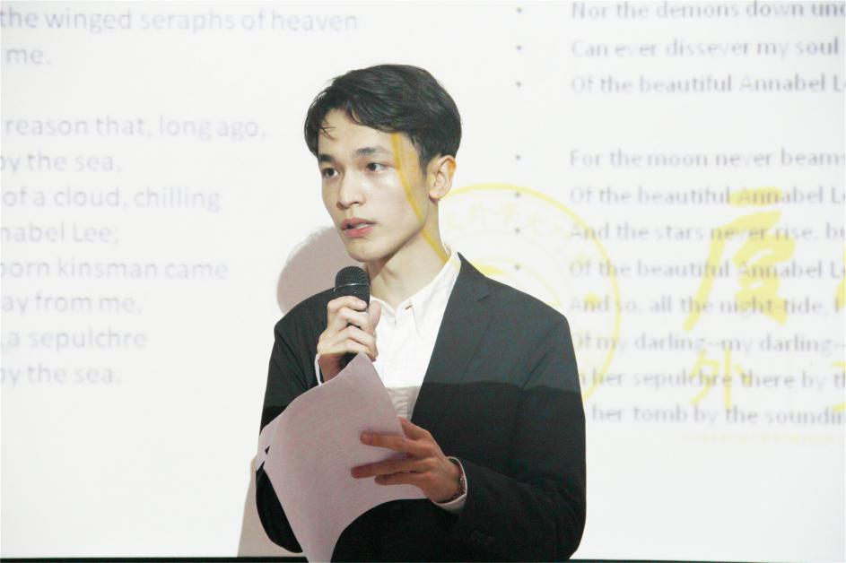 诵读比赛共分为诵读、关键词即兴演讲和评委提问三个环节。每位选手根据抽签结果首先上台进行诵读和即兴演讲。诵读内容选自于莎士比亚、叶芝、惠特曼等英美文学巨匠的经典诗歌原文,主要考察选手们诵读时的语音语调和对诗歌的理解。诵读完毕后进入即兴演讲环节,主题包括“教育”、“幸福”、“网购”、“二胎政策”等经典和社会热门话题,注重考察选手遣词造句和流畅表达英语语言的能力、思辨能力以及临场应变能力。随后,外教评委Nicholas根据每位选手的诵读内容或演讲内容进行提问。在诵读环节中,选手们的表现各具特色,通过语调、肢体动作等表演形式,将自己对诗歌的理解创造性地表达出来。在即兴演讲和评委提问环节,选手们或慷慨激昂,或从容淡定,充分展示了他们扎实的专业功底和沉稳的舞台表现力。