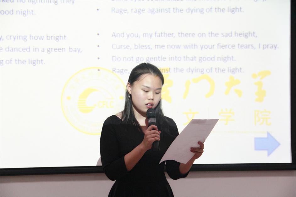 下午14时40分,诵读比赛正式开始。厦门大学外文学院副院长李美华教授,福建省外国语文学会会长、厦门大学外文学院英语系杨信彰教授,集美大学外国语学院院长黄锐教授,厦门理工学院外国语学院院长张跃军教授,复旦大学外文学院张冲教授,厦门大学外文学院英语系陈菁教授、苏欲晓教授以及外教Nicholas担任大赛评委。