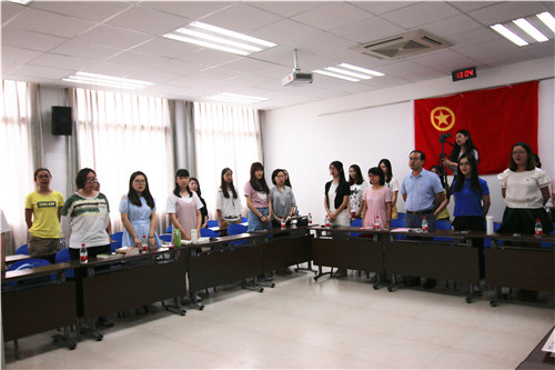 5月12日中午12时40分,外文学院纪念建团95周年系列活动之“不忘初心跟团走,重温入团那一天”在南光三415教室如期举行。学院团委书记、研究生辅导员乐无恙老师,团委副书记、2016级本科生辅导员肖盈老师,2015级本科生辅导员周晓牧老师,2013级、2014级本科生辅导员杨盛澜老师以及兼职辅导员们出席了本次活动。外文学院2016年度优秀共青团员、优秀团支书和2017年新发展团员悉数到场。活动在庄严的国歌声中开始。