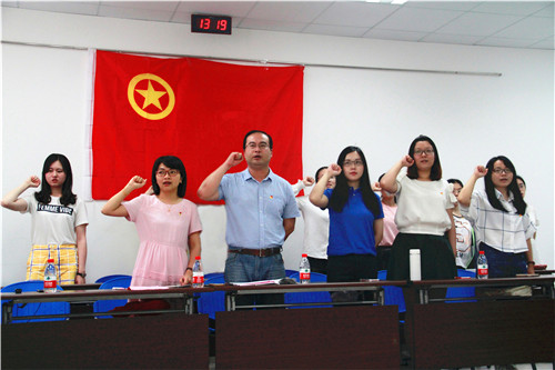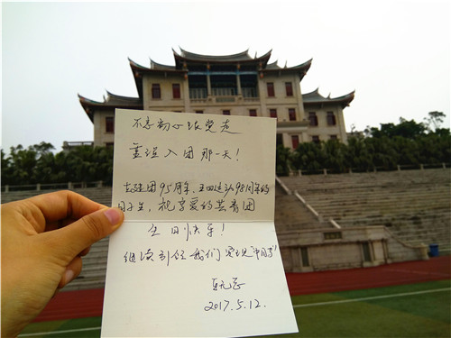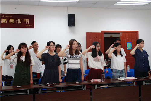 随后,2016年度厦门大学十佳共青团员、2013级英语专业本科生肖宁双同学带领现场团员们重温入团誓词。面对鲜艳的团旗,大家以最洪亮的声音、用最真挚的心声庄严地宣誓:我志愿加入中国共产主义青年团,坚决拥护中国共产党的领导,遵守团的章程,执行团的决议,履行团员义务,严守团的纪律,勤奋学习,积极工作,吃苦在前,享受在后,为共产主义事业而奋斗。誓词掷地有声,提醒着大家作为一名共青团员肩负的责任和义务。