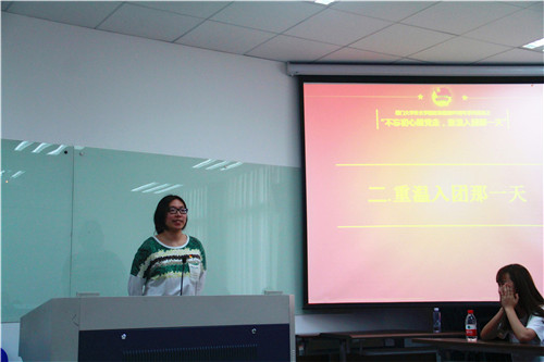 首先进行的是新团员入团仪式。乐无恙老师上台宣读了外文学院2017年新发展团员名单,共有六名同学新加入中国共青团这一大家庭,乐老师代表学院团委向新团员们表示诚挚的祝贺与欢迎。回忆起自己入团的那一天,乐老师感慨万分,并对青年团员们提出以下几点期待:一是青年要立志做大事;二是青年要用真善美来雕琢自己;三是青年要不忘初心跟党走;四是青年要学会把实践和思考相结合;五是青年要正确对待成败得失。乐老师希望大家珍惜当下、把握今天,牢记“厦大人”的使命,共同为厦大续写明天的光荣和精彩。