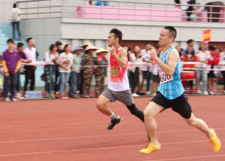 上午10时45分,观众们迎来了激动人心的研究生男子组400米决赛。外文学院2015级硕士生许益海和2016级硕士生徐向前代表学院出战。赛前,两位运动员在候场区做俯卧撑,积极热身,对即将到来的比赛成竹在胸。起跑线上,两位运动员做出专业起跑姿势,只等指令员一声令响,飞一般地冲向前方。400米是对运动员速度和体力的双重考验,前半圈,两位运动员在保持不掉队的前提下积蓄体力,后半圈奋起直追,在小组赛中赛出了风采。