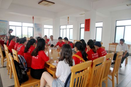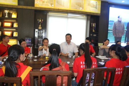 上午8时,实践队来到台品茶园,计划对永福镇台湾农民创业园投资第一人????谢东庆先生进行访谈。谢东庆首先邀请队员们来到观景台欣赏茶园全貌。放眼望去,只见连绵的茶山上间种着樱花树,这便是“中国最美樱花圣地”????台品樱花茶园。谢董简要介绍了茶园樱花的习性、花期及茶园目前的经营状况,特别强调要把茶叶种植和生态观光旅游结合起来,将台品茶园打造成为综合性休闲农场。接着,他邀请队员们品尝公司生产的乌龙茶和红茶。大家边喝茶边听谢董分享自己当初来到永福开拓茶园的创业经历,队员们不禁为他“敢为天下先”的精神所折服。随后,他回答了队员们提出的有关公司茶叶培植技术、市场销售、发展蓝图等问题。同时,他也深刻指出限制公司发展生态观光旅游的几大因素,如基础设施不完善,电费和汽油价格较高等。队员们听了谢董的分享连连点头,若有所思。
