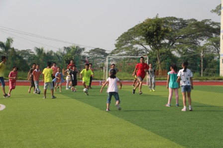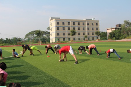 7月25日上午第一节课是足球课,吃罢早饭,支教队老师乔治早早就来到操场,准备好足球课上要用的器材。不一会儿,孩子们便蹦蹦跳跳地来到操场,围着这位外国大哥哥,叽叽喳喳说个不停。孩子们集合完毕,乔治老师先带领大家做热身运动,然后将孩子们分成三个小队,开始了课前游戏环节。接力跑、带球接力跑、八字形接力跑,乔治老师循序渐进的教学让孩子们渐入佳境,“快跑!快踢!”一时间,加油声,欢呼声此起彼伏,仿佛这个夏日里最跃动的音符。游戏环节之后,乔治老师根据年级将孩子们分成低年组和高年组开始正式比赛。随着老师的一声令下,孩子们或奔跑,或防守,各司其职,操场上一片热火朝天,虽然一个个汗流浃背,但劲头却丝毫不减。经过一番激烈的角逐,最终高年组以2:0胜出。但此时对孩子们来说,输赢已经不重要,一起跑,一起笑,相互合作,彼此快乐,这就是他们最大的乐趣。