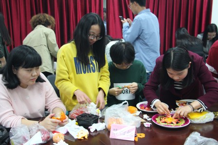 如果说插花将女生们的浪漫情怀体现得淋漓尽致,那么水果拼盘组女生们的巧手匠心也在比赛中得到了充分施展。比赛前还只是一个个不起眼的普通水果,在一双双巧手的精雕细琢下,如同被施了魔法一般,蓦地变成恭贺母校95寿诞的生日蛋糕、霸气十足的“九五至尊”,还有那清风习习的芙蓉湖景以及优雅游弋的天鹅。形态之丰富,想象之新奇,令人称奇。“花”“果”各具特色,但表达的既是对外文学院女研究生们的无限祝福,亦是对母校的崇敬之情!