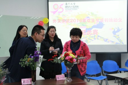 伴着春日里和煦的微风,外文学院的女生们又迎来一年一度的女生节。为了庆祝此次节日,外文学院研究生团总支、研究生会于3月7日晚在南光三举办外文研究生女生节经典活动――水果拼盘与插花大赛。本届比赛作品以厦门大学为主题,为即将到来的厦大95周年华诞献上祝福。外文学院党委书记陈志伟,党委副书记郑新风,副院长陈端端、徐琪,英语系副主任辛志英、林斌,院团委书记乐无恙及辅导员张闻博出席本次活动并担任比赛评委。