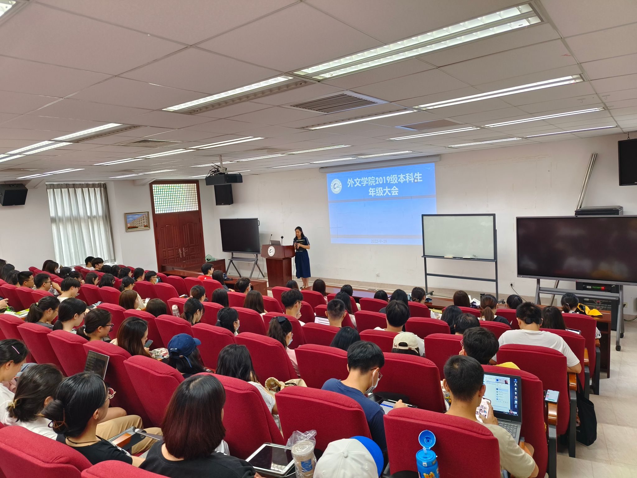 为切实做好2023届毕业生教育活动,引导毕业生做好规划,调节心态,砥砺前行,9月29日中午,外文学院于德贞楼112报告厅召开2019级本科生年级大会,院团委副书记、2019级本科生辅导员戴晓燕召开会议,全体2019级本科生参会。