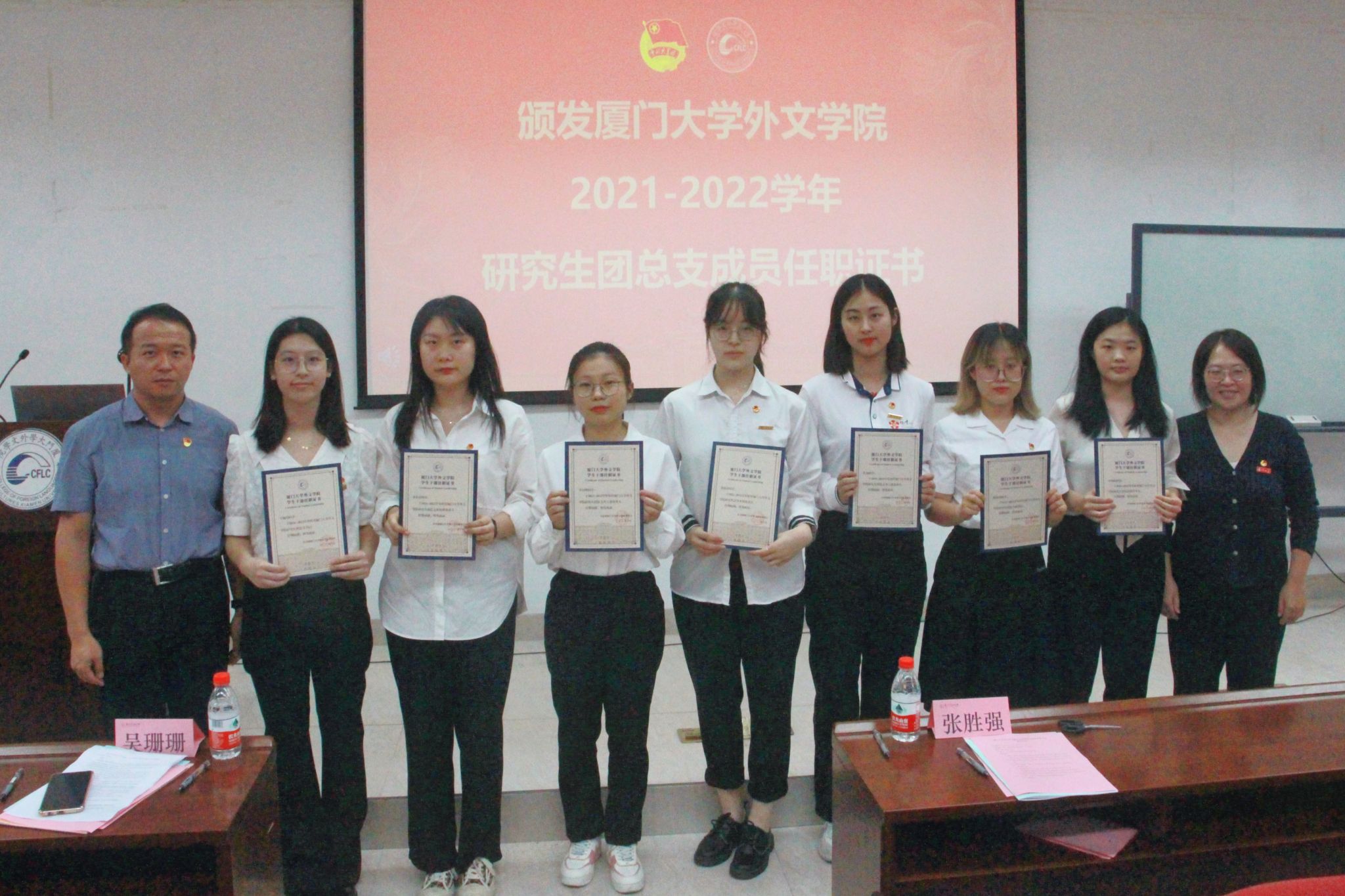 吴珊珊、蔡宇为研究生团总支成员颁发任职证书,对他们过去一年的付出表示感谢,同时希望新一届团总支成员继续发扬优良传统,不畏挑战,砥砺前行。