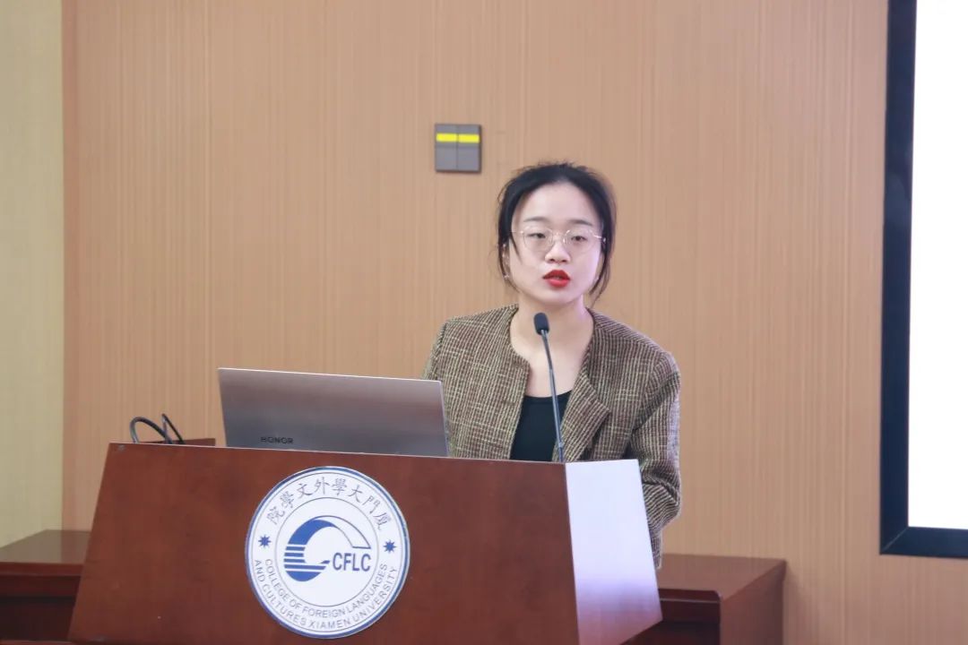 厦门大学第二期“职业体验·大学生社区挂职计划”参与者王楠同学结合社区挂职经历,分享在社区的所见所闻所思所想,着重介绍“社区实践怎么做”。她指出,同学们可以借鉴社区开展主题教育的活动经验并结合学院的实际情况,举办更多符合同学需求、体现外文特色的活动,并期待更多同学能够加入大学生社区实践的队伍。