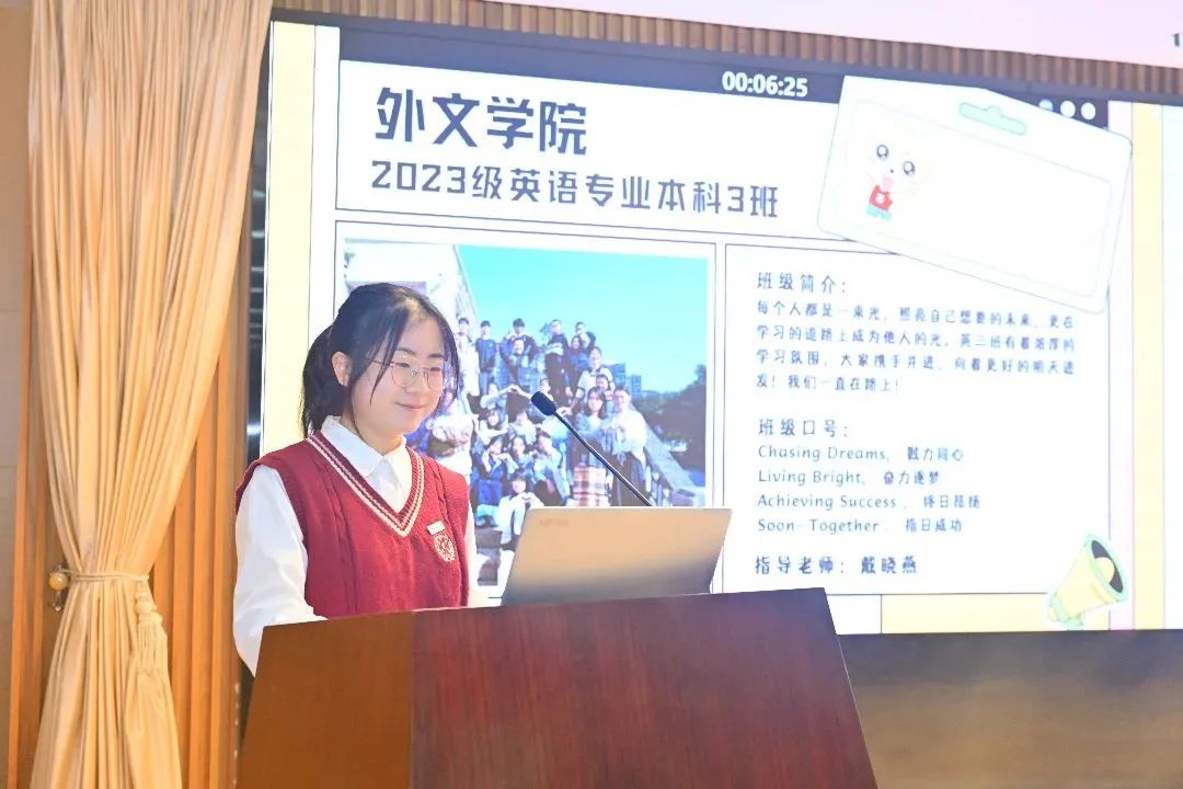 为深入学习贯彻习近平新时代中国特色社会主义思想,健全网络育人综合治理体系,多渠道、全方面展示班级风采,学校于2023年11月-12月举办2023年“网络文明班级”评选活动。学院2023级全体本科班级积极参与,认真备赛,开展学习团建等活动,团结一致,凝聚力量。决赛现场,入围班级以演讲、表演等多种形式全方位展示班级特色风采和文化,体现了外文学子的蓬勃朝气与学院班风建设成果。