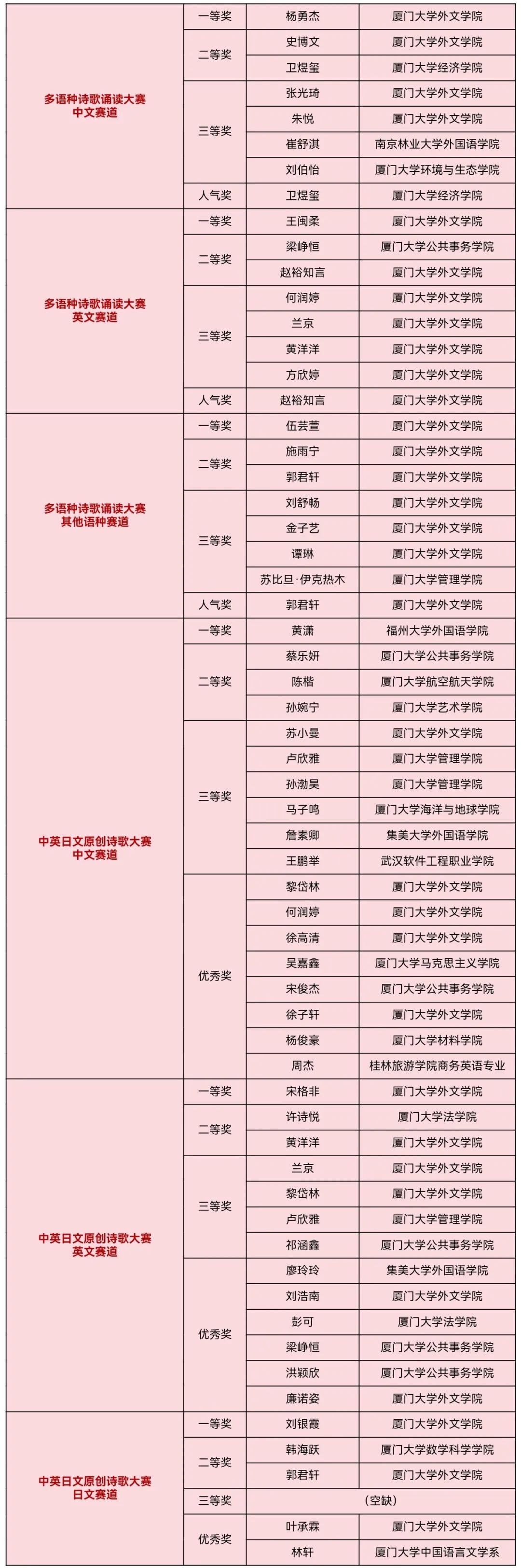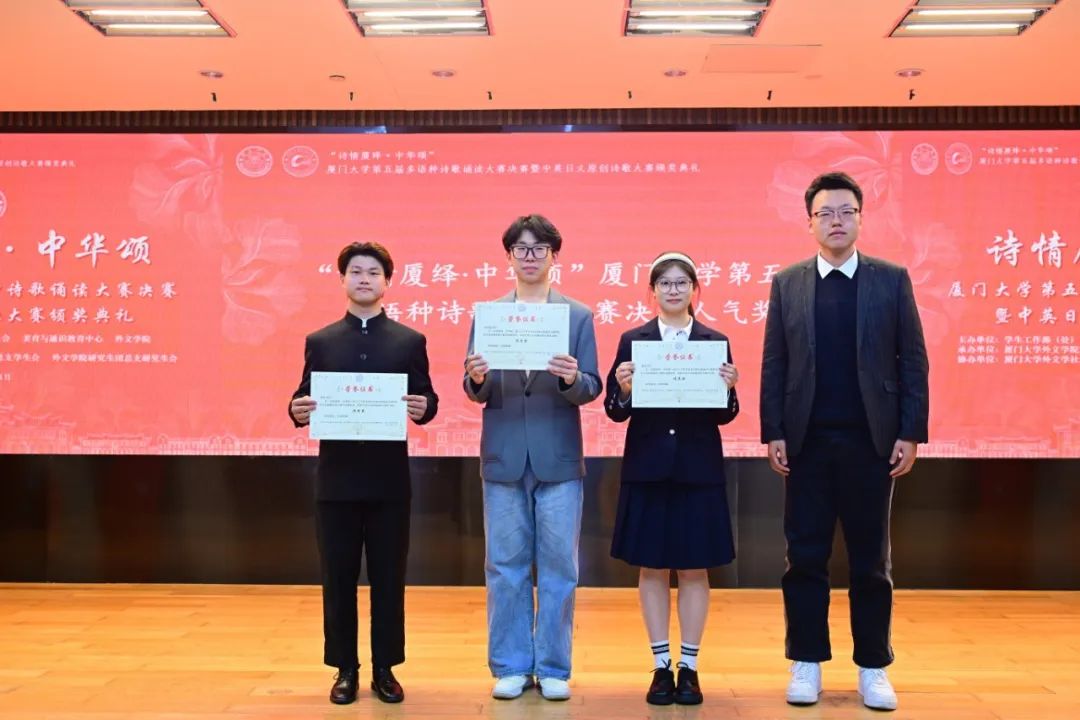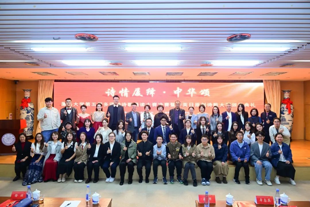 在热烈的气氛中,“诗情厦绎·中华颂”厦门大学第五届多语种诵读大赛决赛暨中英日文原创诗歌大赛圆满落幕。此次比赛是一场文字与声音的盛宴,不仅传递了中华文化之美,也展现了青年学子对经典的深情演绎,期待今后有更多同学踊跃加入这场文化盛会,共同书写属于当代青年的诗意篇章!