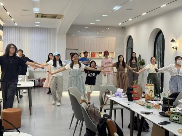 最后的养生解压操环节,同学们模仿视频一起舞动起来、跳起来,沉甸甸的压力包袱也随之甩掉!身体的轻松也带来了心情的舒畅。