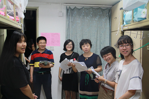有朋自远方来,不亦乐乎。学院对新同学们的入学、入住情况表示高度关注,领导老师们先后走访了凌云二、芙蓉九这两栋外文学院新生所在的宿舍楼。老师进门后,同学们用热烈的掌声欢迎老师们和学长学姐的到来。领导老师们请每位同学作了自我介绍,并亲切询问他们来自何处、是否习惯住校生活、对大学生活的想法等。老师们还询问了同学们的兴趣爱好,希望大家能够在开学后勇敢地展示自己的特长。同时,领导老师们也向大家再三强调了宿舍安全问题。老师们的和蔼笑容和平易近人的语气使交谈氛围十分轻松,其言谈中句句都流露着对同学们的关切。新生们也都大方地自我介绍,与老师热情地交流。