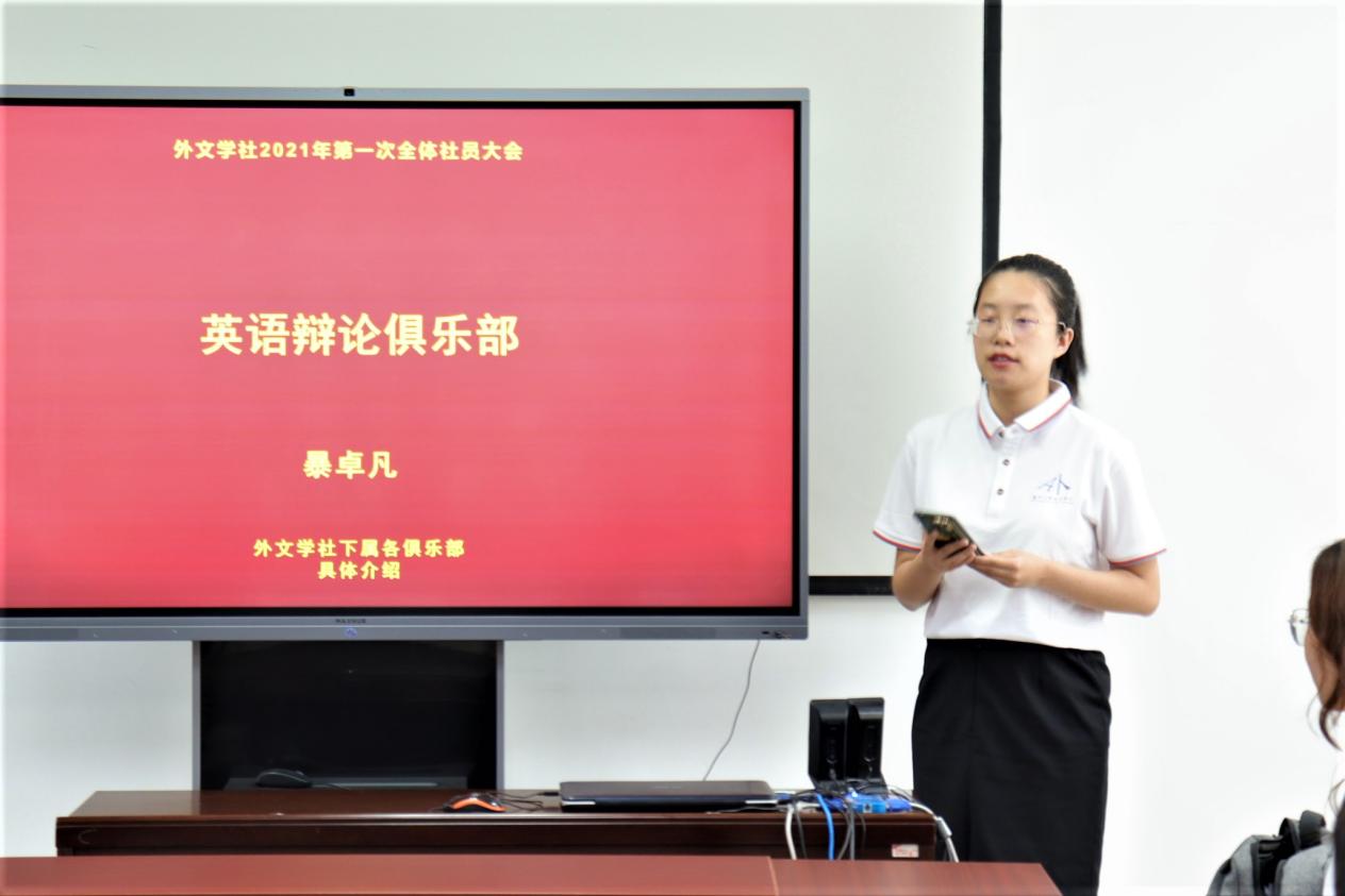 接下来,外文学社下属各俱乐部负责人介绍了各个俱乐部的发展情况与未来发展规划。多语种俱乐部负责人、外文学院2019级英语专业本科生张书萍首先发言,她表示,过去一年里,多语种俱乐部积极开展了法语小课堂、德语小课堂、日语小课堂及英语角四项活动。未来,俱乐部将会继续发扬活动形式多样、氛围轻松、内容充实的优势,积极探索如movie night、优秀外语电影作品展映会、英语诗歌欣赏之夜、英文原著读书交流会等更加丰富多彩的活动形式。