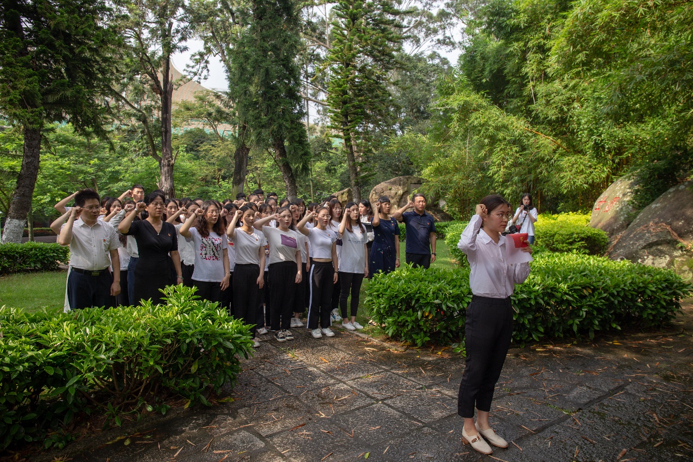 为庆祝中国共产党成立98周年,重温峥嵘岁月,缅怀革命先烈,6月26日下午,外文学院党委组织开展了“党旗下的党课”暨新党员入党宣誓活动,激励青年党员秉承爱国之志,不忘初心、牢记使命,为新时代贡献青春力量。外文学院党委书记陈志伟,党委副书记杨云良、沈丽秀,党务秘书余晓芳,本科生第一党支部书记、本科生辅导员蔡宇参加了活动。本次活动由外文学院本科生第一党支部承办。