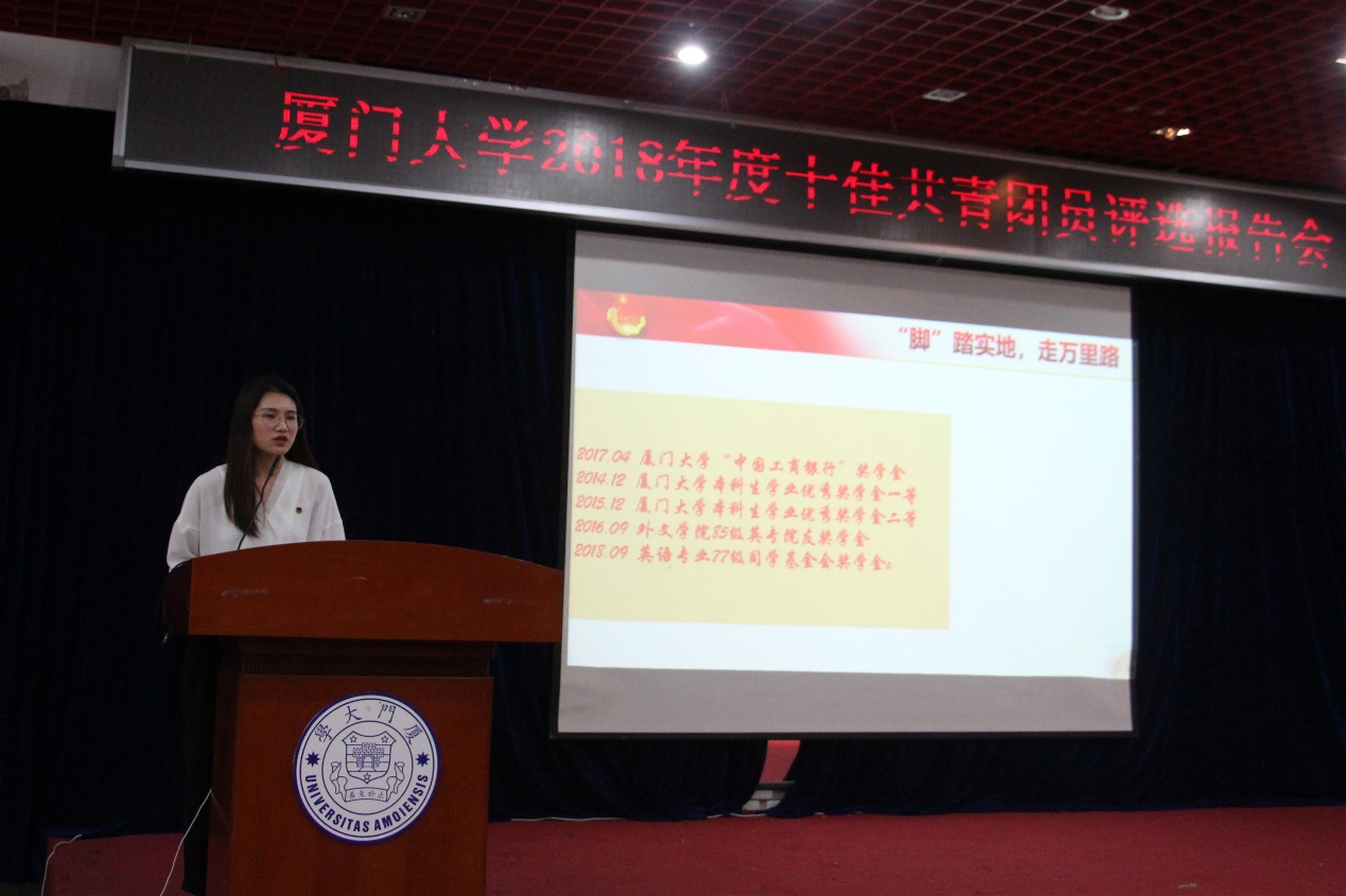2018年度“十佳共青团员”评选活动于4月2日晚举行。杨文雅同学以“我画我自己”为题,从政治素养、学生工作、专业学习、实践公益等方面讲述了自己的成长和收获。作为校第八期“学生马克思主义理论研修班”党支书及学院翻译硕士党支部宣传委员,她始终坚持用党的先进理论知识武装大脑,不断坚定理想信念,并认真开展好各项党务工作。自本科开始,她便积极投身学生工作,先后担任班长、学院兼职辅导员、院研究生会副主席、校研究生会权益部部长等,勇于担当,服务同学。除坚持在学业上勤奋耕耘、做学术的专研者外,她还关注实践公益,在服务社会的同时,也让自身得到了锻炼和成长。最终,杨文雅同学成功获评“十佳共青团员”。