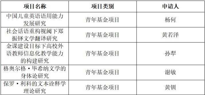 本次申报之所以获得较大突破,更离不开学校领导、社科处的精心布局和细致指导。社科处领导长期以来一直关心外文学院的发展,多次到学院指导项目申报工作;社科处负责老师通过开展申报评审、标书审核等,为申报教师提供了细致周到的辅导服务。