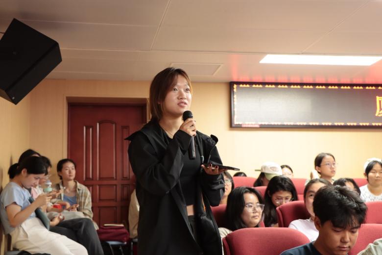交流互动环节,同学们积极提问,锦绣学姐耐心解答,给予同学们更多的启发。面对人生百态,学姐活在自己的时区,坚持自己心中的那份理想与纯真,在那条人迹罕至的小路,一步一个脚印走下去。最后,她对同学们表达了热切的期望:在今后的人生中,努力去实现自我的人生价值。