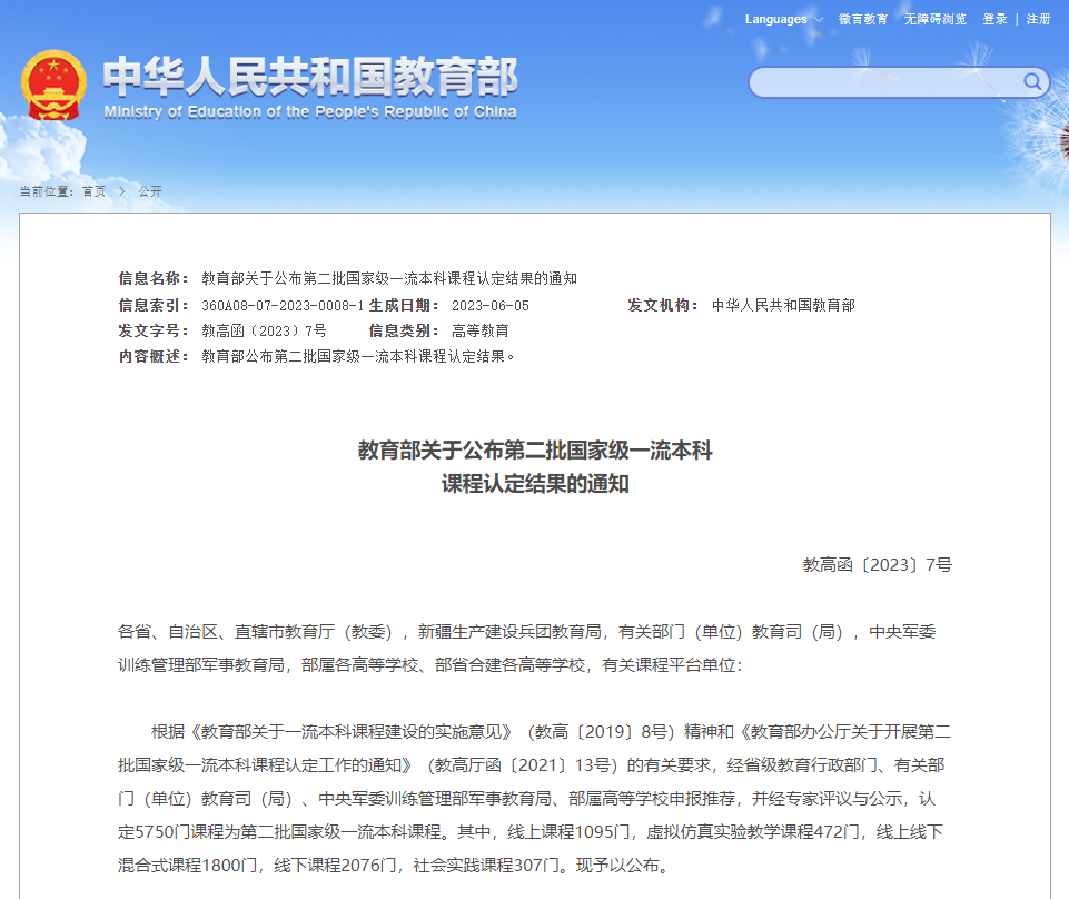 据悉,此次认定根据《教育部关于一流本科课程建设的实施意见》(教高〔2019〕8号)和《教育部办公厅关于开展第二批国家级一流本科课程认定工作的通知》(教高厅函〔2021〕13号)的有关要求,由各省级教育行政部门和高校申报推荐,经专家评议与公示,认定5750门课程为第二批国家级一流本科课程。其中,线上课程1095门,虚拟仿真实验教学课程472门,线上线下混合式课程1800门,线下课程2076门,社会实践课程307门。