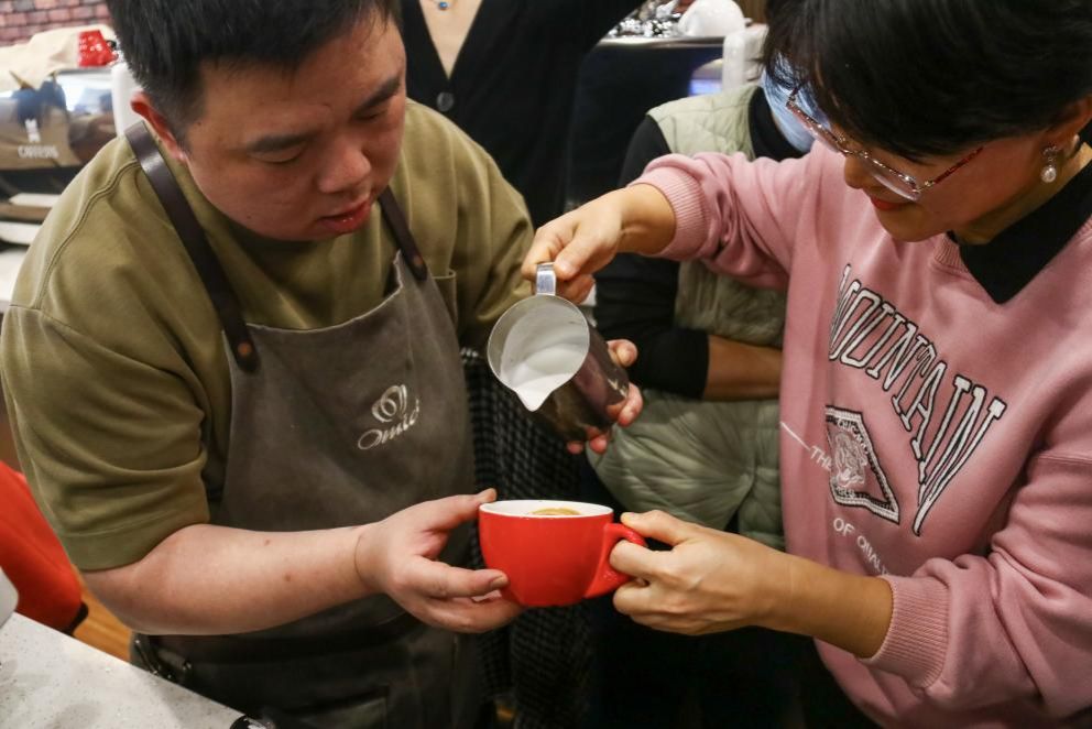 咖啡拉花对技巧要求更高。师生们不仅享受了一场干货满满的咖啡文化课,了解到咖啡的诞生、物理化学特性、地理分布、种类划分,更是在培训老师的指导下,亲手打磨咖啡豆、萃取咖啡、打发奶泡,勾勒出一朵朵别有趣味的花纹。指导老师为大家讲解咖啡的制作过程,他告诉大家,“我希望你们是真的热爱,把它当成一门艺术,而不是谋生手段”,引起了现场不少老师的共鸣。一朵朵精致的拉花浮现在杯中,香气氤氲,“女神”们手捧着自己精心制作的咖啡,尽情享受着午后悠闲的美好时光。