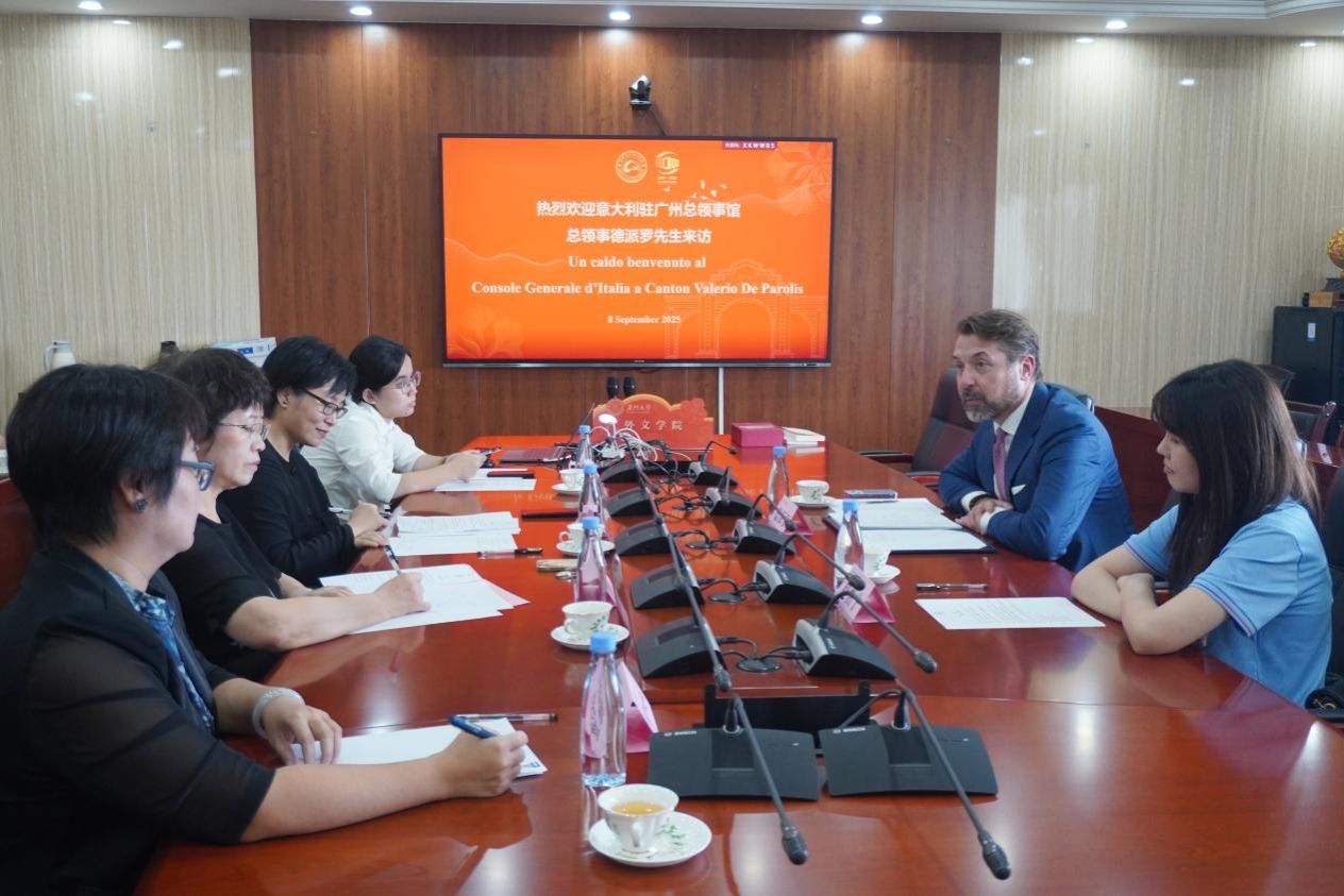 9月8日下午,意大利驻广州总领事馆总领事德派罗(Valerio De Parolis)先生来访华体网,院长陈菁教授、副院长刘悦教授、意大利语讲师许盈盈博士等参加本次座谈,座谈由刘悦副院长主持。