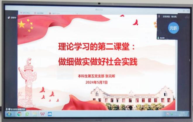 第五期“扬才班”摄影摄像剪辑组组长、外文学院2022级硕士研究生张元昕就理论学习的“第二课堂”——校外社会实践进行分享,指出社会实践除了能收集调查研究的一手资料外,还是支部立项的实操平台,更是凝聚支部成员的有效措施。她表示,要团结各方力量,发挥党员所长,做细做实做好社会实践。