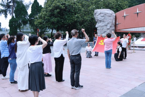 巍然矗立。全体参训党员列队肃立,怀着无比崇敬的心情向长眠于此的革命先烈行鞠躬礼并敬献花篮,以最崇高的礼节表达对先烈们的深切缅怀。在徐琪同志的领誓下,全体党员重温入党誓词,以铿锵誓言表达不忘初心、牢记使命的坚定决心。