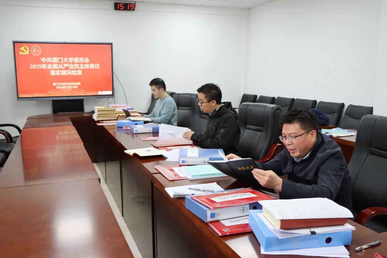 12月19日下午,厦门大学党委常委、副校长吴超鹏带领校党委2025年全面从严治党主体责任落实情况第七检查组赴外文学院开展检查指导工作。校党建办主任兼组织部副部长、教师工作部副部长葛郝锐,校党委教师工作部副部长葛学凤,校学生工作部(处)副部(处)长兼学生公寓学生工作办公室主任、人民武装部副部长陈国全,校党建办秘书林志伟参加检查。外文学院党政班子成员、党支部书记和党员代表参加汇报会及座谈会。
